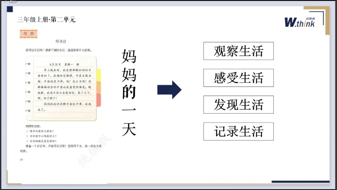 例如,可以以《妈妈的一天》为观察和记录的题材,要求学生留意妈妈在周末的生活轨迹和行动的细节,听听妈妈说了什么,观察妈妈做了什么,还要思考妈妈言行背后的思想和感情。如果学生有这样具体指向的日记需求,那么写完这篇日记后,他们是否会对妈妈的辛勤付出有所改变?原本对妈妈的付出视而不见、听而不闻、漠不关心的生活态度是否会有所转变?通过这个过程,学生不仅实现了语文学科要素的落实,也达到了育人目的。基于观察、感受、发现和记录所生成的日记和生活的分享,学生在思考中获得了爱的温度、深度的思考,以及充实的语言交流体验。