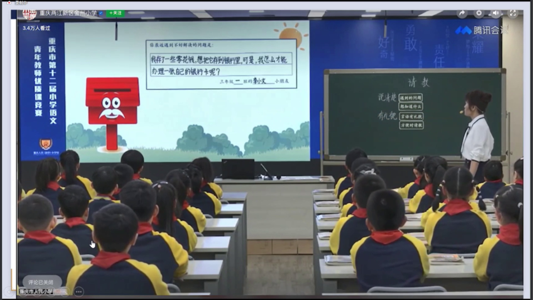 接下来,曹老师通过借助请教的情境来逐一讲解步骤:需要明确请教的对象、如何用礼貌的言语......解决了这些问题后,曹老师又提出一个新问题:一个小朋友想把零花钱存到银行,应该怎么办?面对这个问题,学生开始请教他人,这回又回到了最初的问题,应该向谁请教。学生说可以请父母和银行工作人员,在两者之间做出选择时,大家发现银行工作人员更合适,于是他们让一个学生当场去向银行工作人员请教。银行工作人员通过手机与现场学生连线,回答了他的问题并告诉他具体操作方法。然后学生回来操作,发现还是没有搞明白,于是通过微课继续解决问题。此刻抛出第二个问题:当我们礼貌地询问之后,仍然有疑问时该怎么办?如何用言辞和节奏提问,以确保更清楚地表达我们的问题?最终我们还需要向别人请教,尤其是在确认某些地方时要重复强调,这样可以帮助我们真正搞清楚问题。简而言之,曹老师在开课之前设置了一个意外情境,让学生认识到请教他人是解决问题的方法,并强调了提问的技巧。所以,通过语文课堂的学习来解决现实情境中的问题,具有很大的实用性和价值。这个方向真的非常有意义和有用。