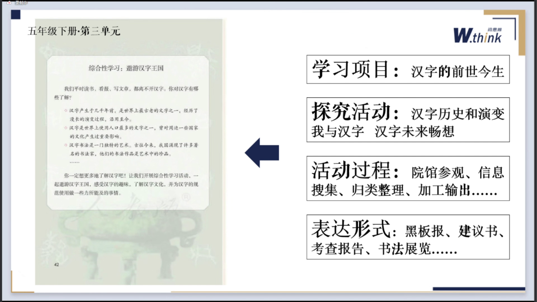 在教材中,已经有一些整个单元的学习活动设计,例如六年级的毕业设计和五年级的遨游汉字王国。在开展综合性学习活动时,可以以汉字的前世今生作为一个学习项目,通过研究汉字的历史和演变来探究汉字的前生,还可以与汉字的现在和未来进行对比,通过参观博物馆、图书馆、美术馆以及利用网络App和小程序的工具,引导学生综合收集、分类、整理和加工信息。最终,可以通过黑板报建议书、考察报告和书法展览等方式来展示学生的综合学习成果。在这个过程中,通过真实的任务驱动,学生们有可能真正地感受到汉字的历史文化,理解中国汉字独特的思维方式和审美秩序。同时,展望未来的信息化时代,将汉字与高科技融合起来,可以增强自身的文化自信。