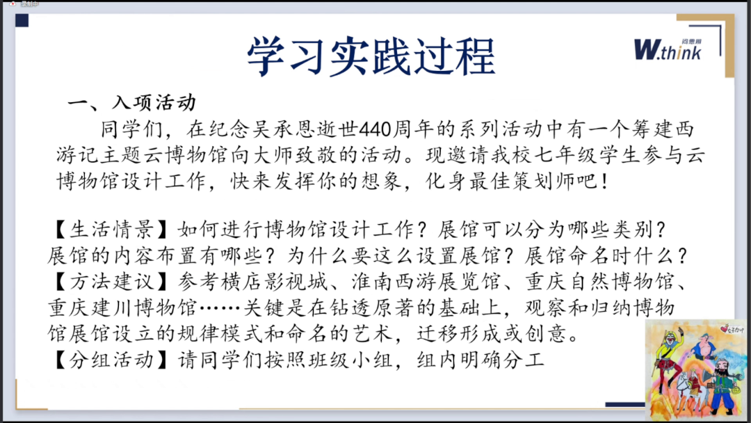 此外,贺老师还以“吴承恩逝世440周年系列活动”为主线,列举了许多案例。【《西游记》的博物馆教学,手抄报项目,西游团队成员简历,西游场景特色美味火焰山,小导游小解说孙悟空孙行者之变,乃至书信归来活动邀请等各个详尽的教学案例分享。】(因内容太多,文章此处略过,欢迎大家从问思辨第七十八期直播回放中详细回顾)